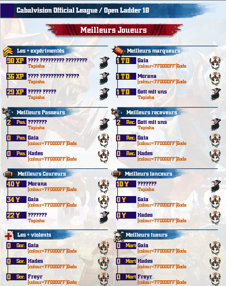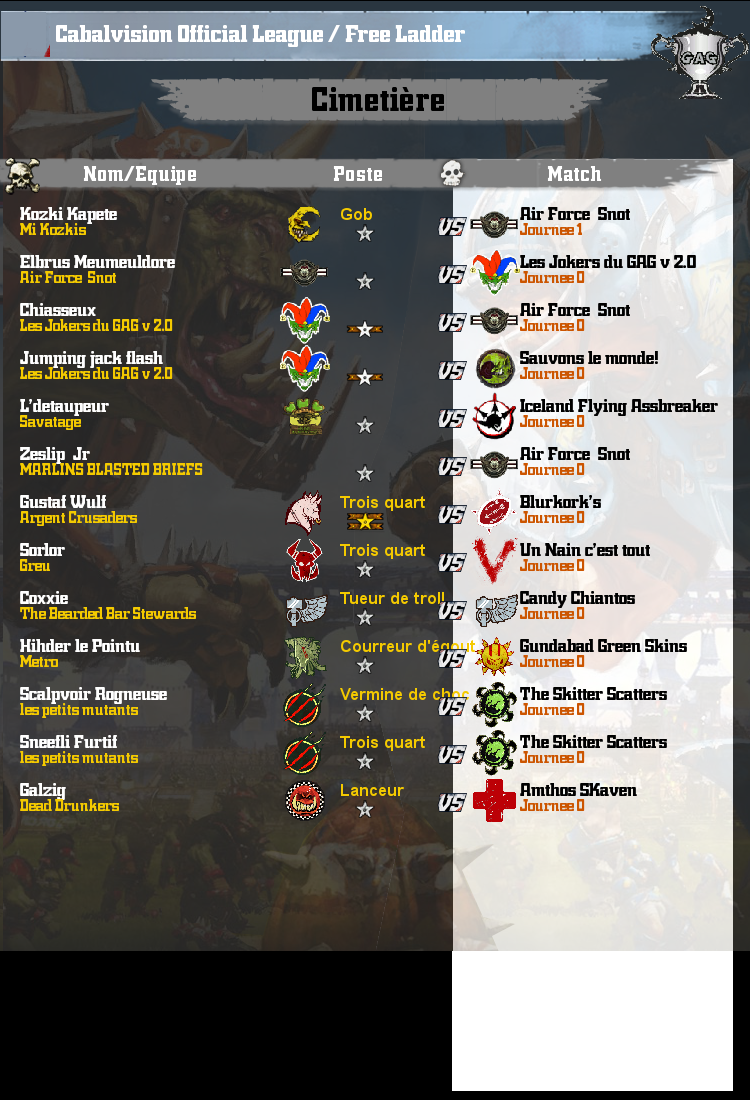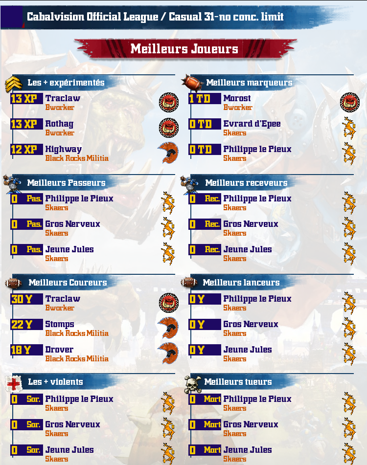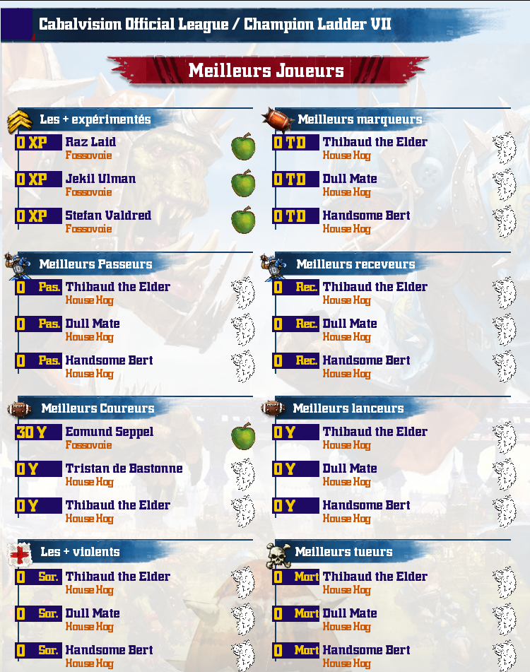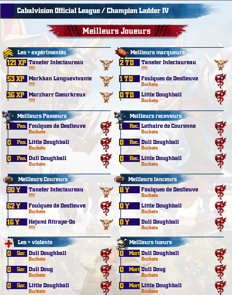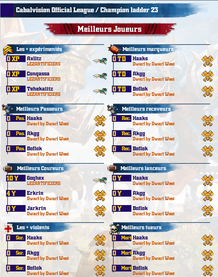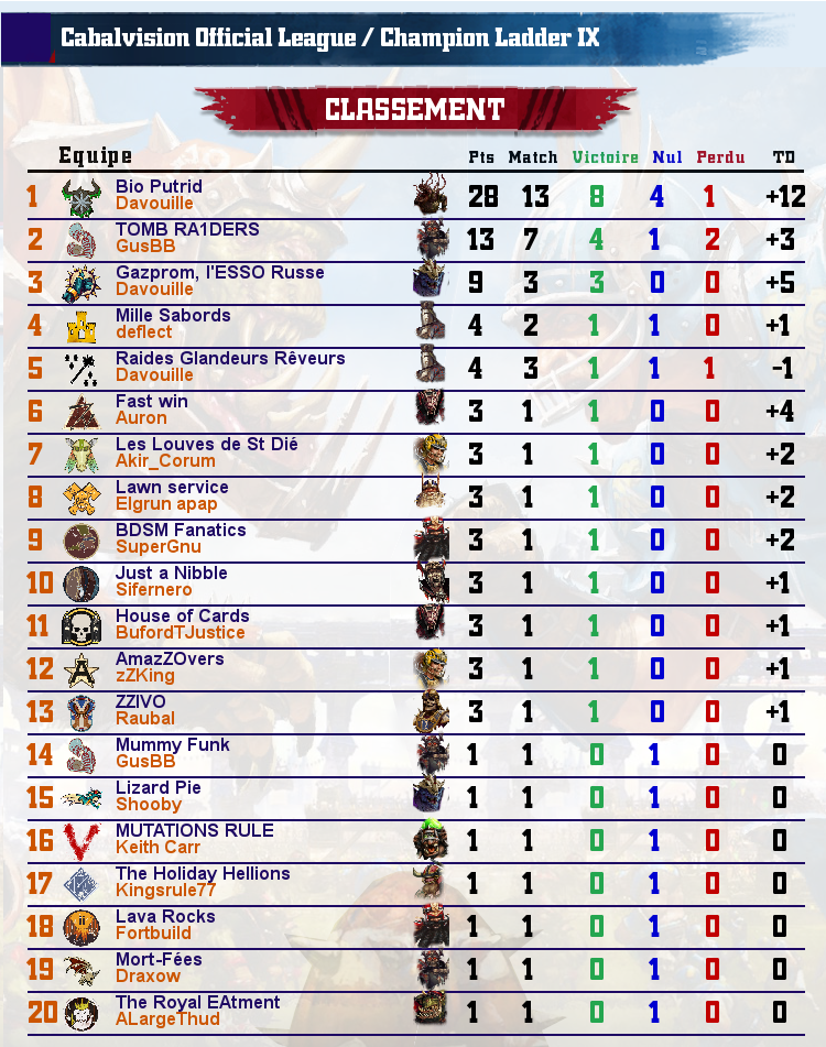 Join the Open Ladder for your quick fix of Blood Bowl - This is your starting place! Compete in the Champion Ladder to qualify for the Champion Cup! Please keep in mind that over 5 concessions as a coach and you're booted for the remainder that season! More info on the official forum.