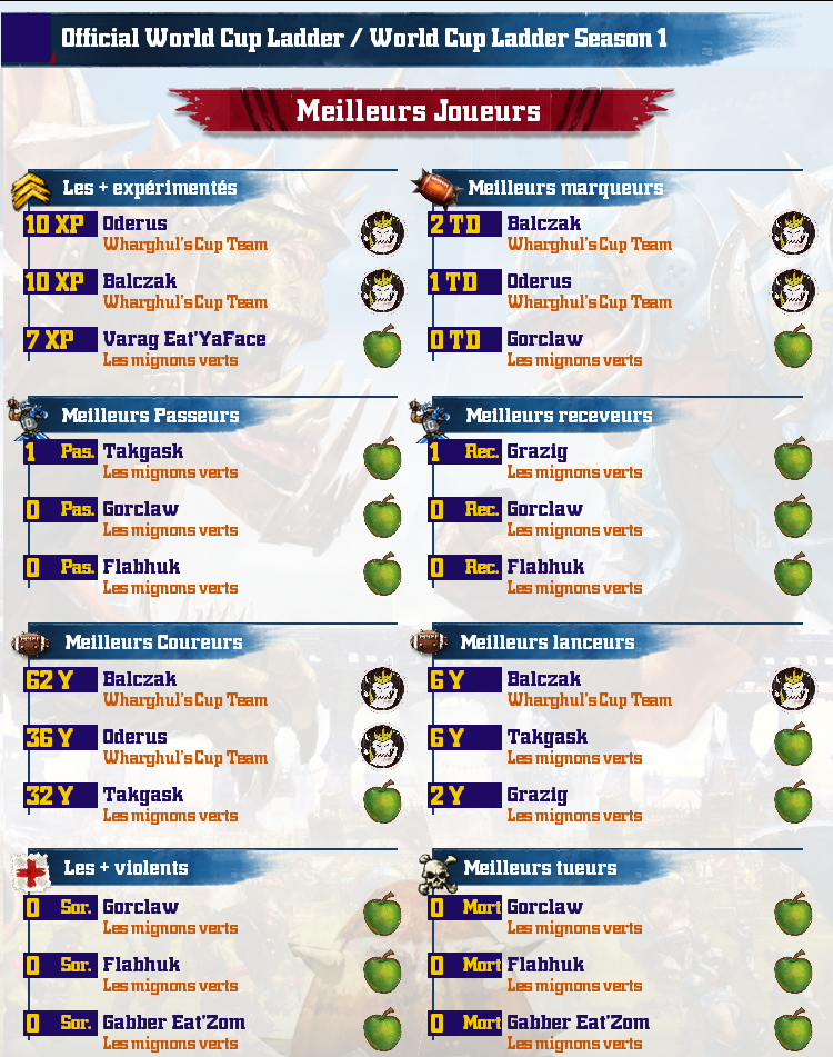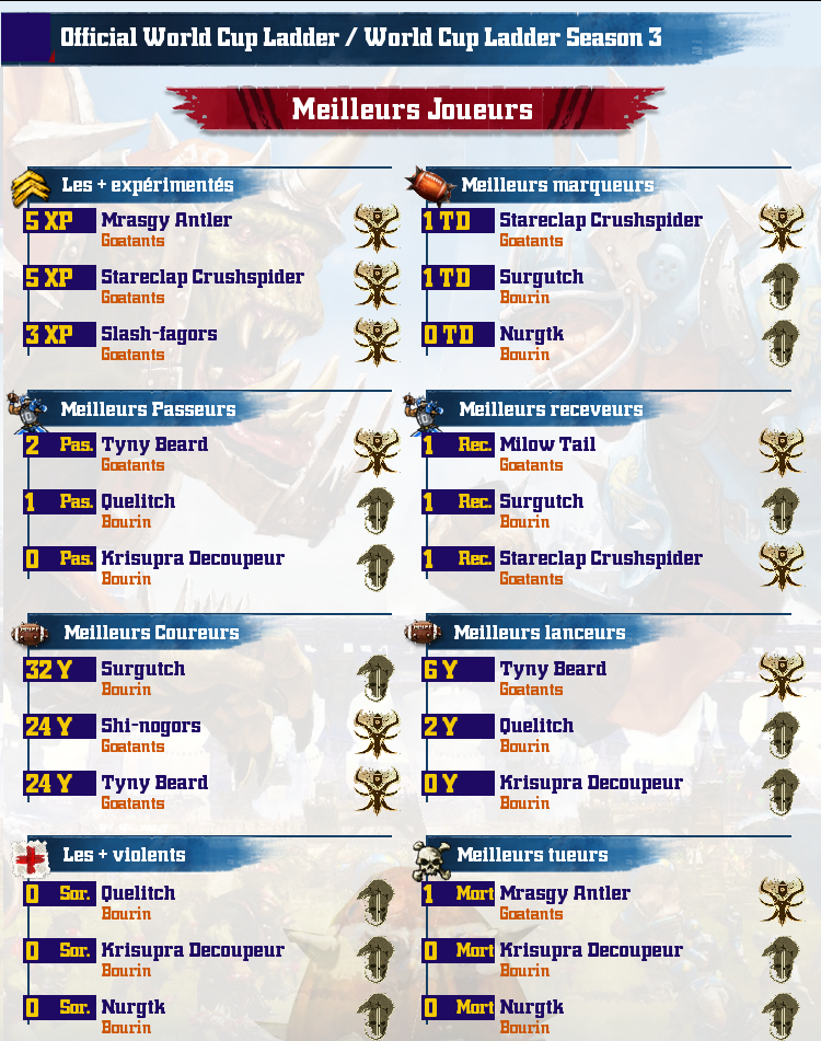 The Official World Cup Ladder is a qualifier league for the Blood Bowl 2 World Cup 2016. It is divided into three seasons of one month each.The first season starts 11 February 2016. At the end of each season, the best 5 coaches will qualify for the World Cup Play Off. More information about the rules, the prizes and how to register on the official Blood Bowl website.