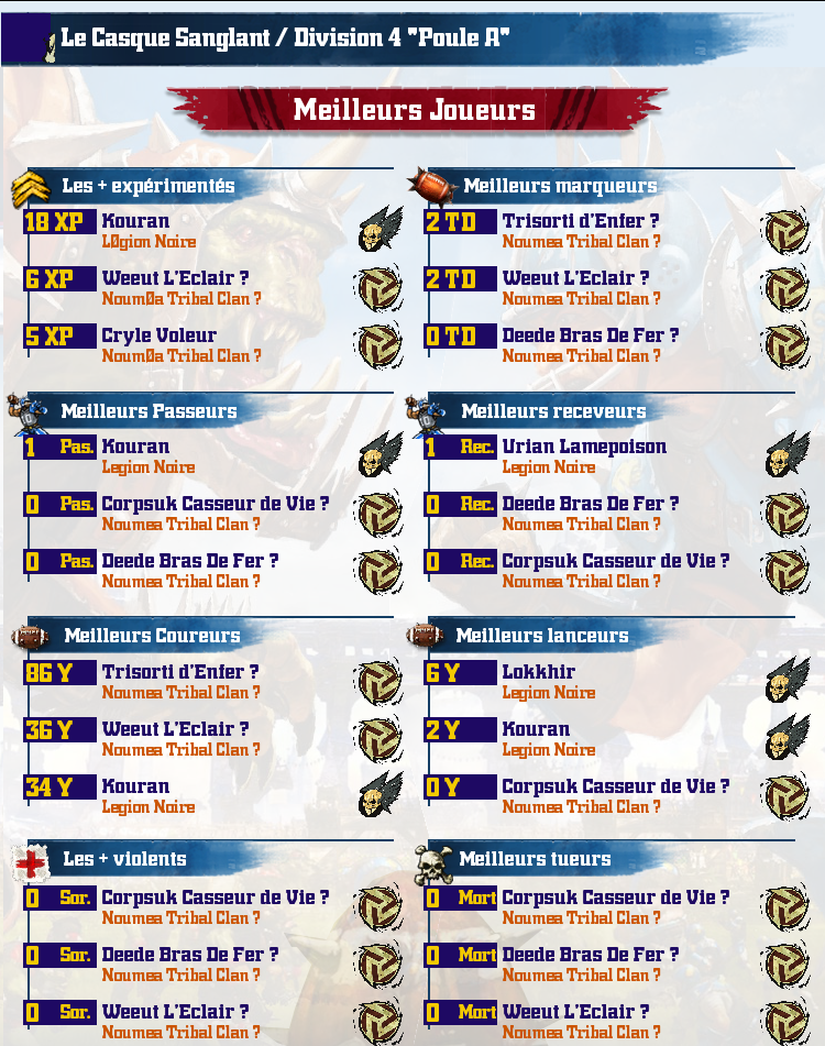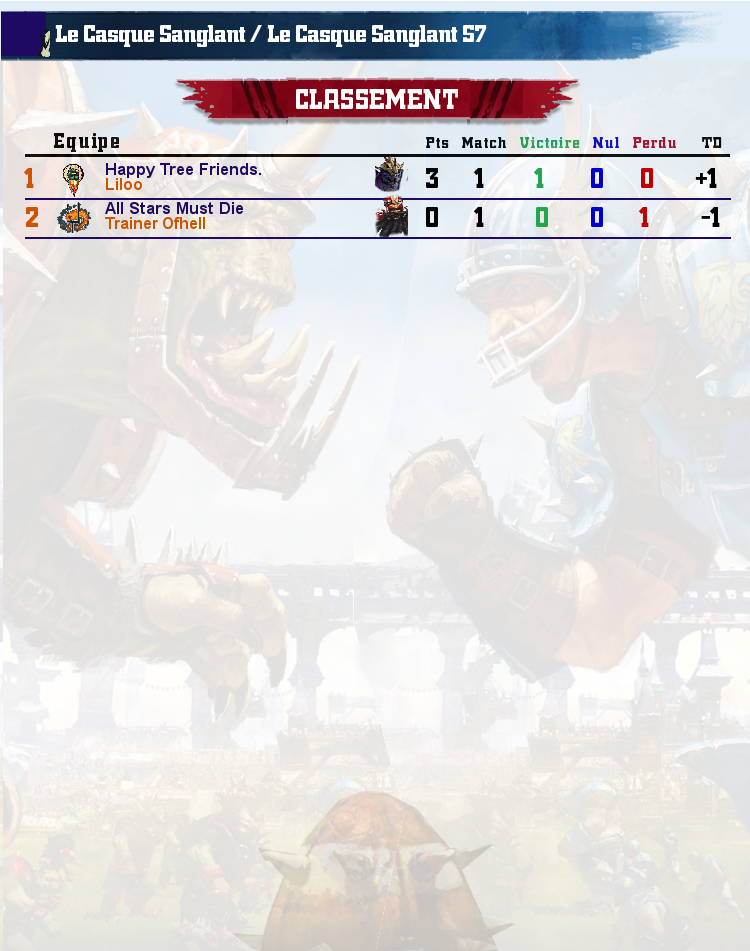 Communauté des joueurs francophones jouant au jeu Blood Bowl 2. Organisateur de l'Open de la Ligue Française 2, Championnat de la LFBB et de Coupes de Blood Bowl. Pour participer, échanger, partager de bons moments, inscrivez-vous !! www.ligue-bloodbowl.fr