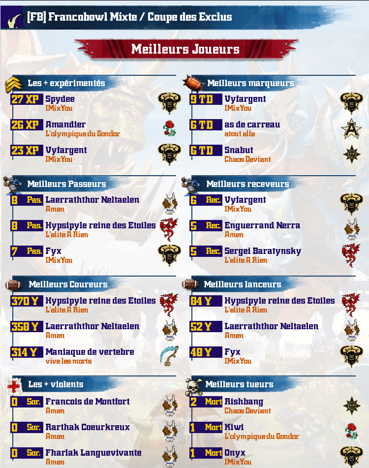 Les équipes mixtes rejoignent le FrancoBowl! Saurez-vous maîtriser la virtuose complexité des équipes mixtes? Un seul moyen de le savoir, venez ici! Inscriptions sur le sujet dédié sur le forum du Francobowl: http://francobowl.com/forum/viewforum.php?f=2459